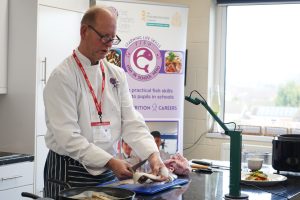 Head of Food and Nutrition, Mr Joe Mann, treated pupils at Queen’s to a day of presentations and cookery workshops from Armed Forces Chefs this week. The day began with Royal Navy Chef, Simon Gray, who trained in catering at Westminster College (alongside the likes of other Westminster Chefs like Jamie Oliver) with fish masterclasses. Chef Simon, who has owned a restaurant, managed multi-site restaurants and has even cooked for royalty at prestigious sporting, demonstrated gutting and filleting fresh seafood, got pupils to make pan-fried mackerel served upon a spicy chorizo and chickpea stew, crispy breaded plaice goujons on a bed of lemon mayonnaise and rocket leaves served in a freshly baked ciabatta roll and cuttlefish prepped and deep-fried. Simon said, “the national Fish In Schools Hero programme run by the Food Teachers Centre that Mr Mann at Queen’s has signed up for is here to ensure that every child gets a chance to prepare, cook and eat fish before they leave school!”