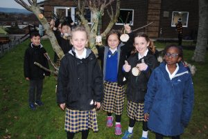 Using recycled paper cups and old coconut shells, they melted the lard in the kitchen classroom and filled them with a homemade bird food mix of raisins, currants, sultanas, grated cheese, breadcrumbs, seeds and cereals. Then the Eco Team hung up their finished feeders with twine on some of the larger trees around Queen’s College.