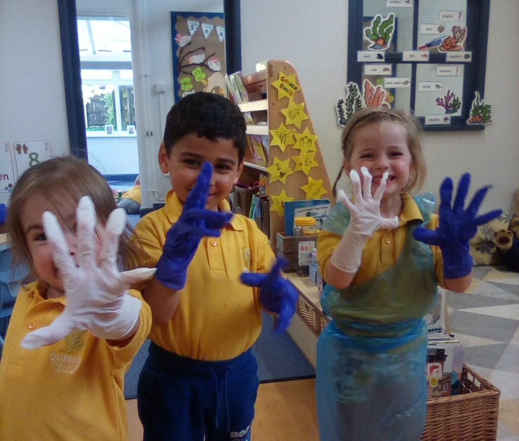 The children have been diving into some exciting new lessons this term, including woodwork and gardening, as well as team games in addition to PE. They also had the pleasure of welcoming some visitors who spoke to the Queen’s Minis about being dentists. The children explored the differences between healthy and unhealthy foods and drinks, and matched pictures to either a ‘good tooth’ or a ‘bad tooth.’