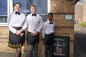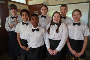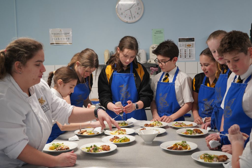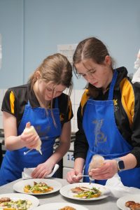 It was wonderful to see the older Sixth Form pupils together with those being taught GCSE Food, Preparation and Nutrition help and support and mentor the younger school pupils to make and serve all the dishes. In the kitchen classroom, Year 12 and Year 13 taught a group of Year 7 pupils about the menu, food preparation, and food presentation while another group of from Year 7 smartly dressed in bow ties and black aprons were instructed on serving the dishes.