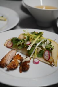 The pupils designed a starter that was a slow-cooked soy, ginger and scallion of Queen’s College pork ribs with a seasonal pear and radish salad. The pork was from the school-reared pigs that were butchered here at Queen’s with garlic grown by pupils outside the restaurant in the school kitchen garden.