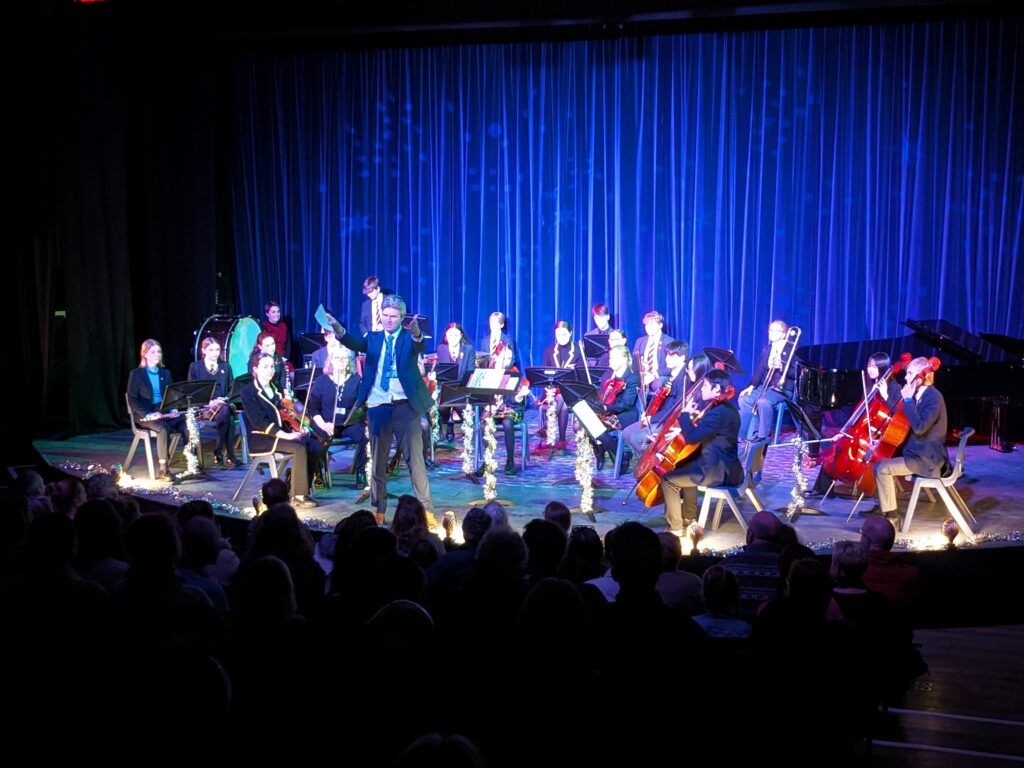 A short interval later, the second half was kicked off in style by the Concert Band with two movements from Vivaldi’s ‘Four Seasons’, aptly enough ‘Autumn’ and ‘Winter’, followed by the jazzy ‘Beachfront’ and rounding off with ‘Christmas Potpourri’, which had the audience clapping along within a few bars! The Senior Quartet then took to the stage with two polished performances of Carol Of The Bells and ‘Fairytale of New York’ to the high standard we now come to expect from them. We then had our final dances of the evening from Lily, Flora and Robyn who were performing lyrical dance solos. This soft, calming and fluid style of dance beautifully encapsulated the magic of Christmas and the students showed great poise and care over their work. Finally String Group ended the evening, with the Brook Green Suite by Holst, Take Five by Brubeck and (as it’s Christmas) a smooth rendition of ‘Let It Snow’, together with snow floating down from the theatre’s snow machine! Their precision and range of tone was particularly note-worthy and they provided a superb conclusion to the concert.