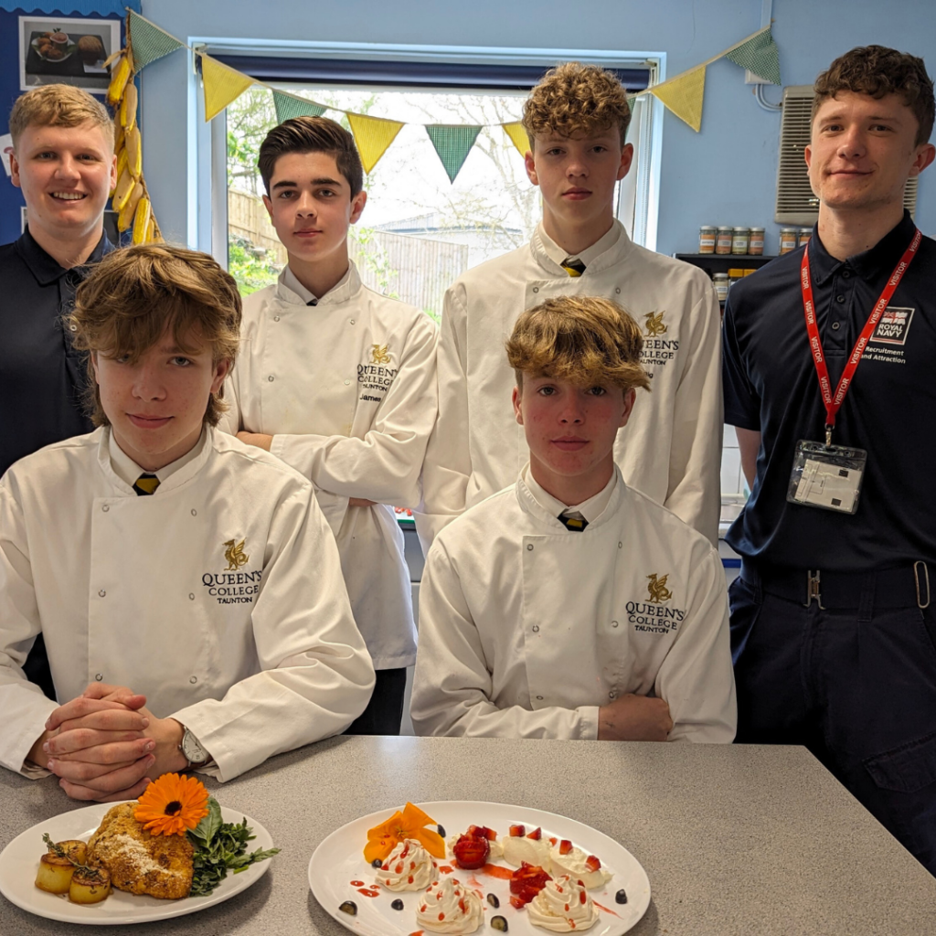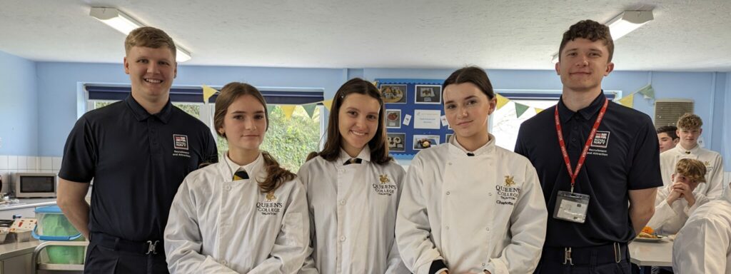 Members of the Royal Navy Recruitment Logistics have paid a visit to Queen’s College to talk about careers in the Navy as well as provide a masterclass in cooking to the GCSE Year 10 aspiring chefs. It was an opportunity for the students to work in teams and learn more about careers in the Armed Forces from catering service professionals from the Royal Navy.