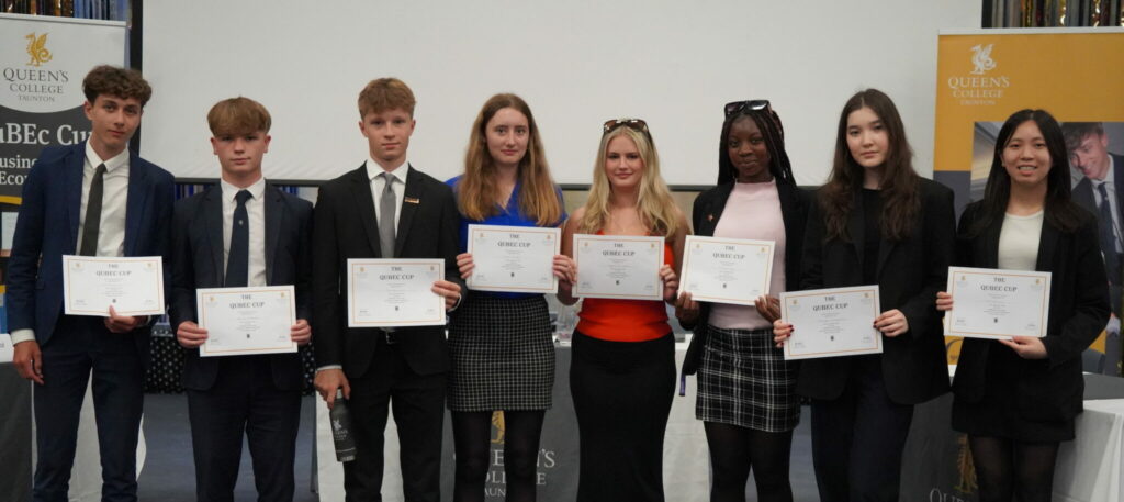 The annual QuBEc Cup Competition took place on Wednesday 26th June, with two teams from Queen’s battling to regain the cup: one Business team and one Economics team. We were joined in the Queen’s Hall by King’s College Taunton, Wellington School, and Blundell’s School to participate in the University Challenge style quiz, with Mr Green as our resident Jeremy Paxman. The proforma being teams buzzing in for quick fire general knowledge questions, if answered correctly they were followed by a specialist question. Overall, there was a fair degree of risk-taking involved in the competition and the students had to use strong realisation skills with their speed and accuracy in problem-solving.