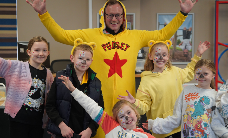 During break time, children enjoyed additional fundraising activities, including face painting, a jumping and rowing competition, and a large collaborative chalk mural of Pudsey the Bear. The mural was creatively decorated with 1- and 2-pence pieces, which the children later added to their growing donation fund.