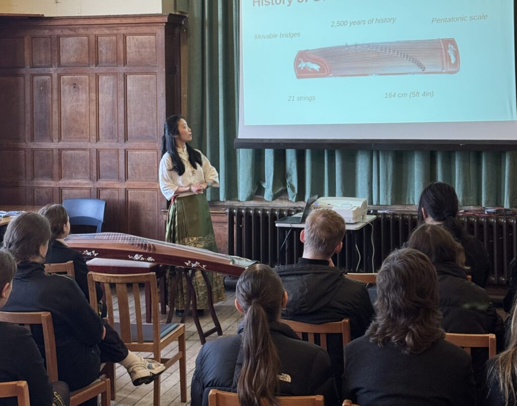 After completing a full restoration of the school instrument over three hours, including the mammoth task of replacing all 21 strings and deep cleaning the sound board, Lydia shared a presentation with the students on the history of the instrument and its developments in music in recent years. She then performed a short recital of five pieces, including Ancient Chinese folk tunes and two modern Chinese pop melodies. The students also had the opportunity to experiment with playing the guzheng whilst exploring the different styles of pick that are available. Thank you to Lydia for her incredible efforts and for restoring this much loved instrument.