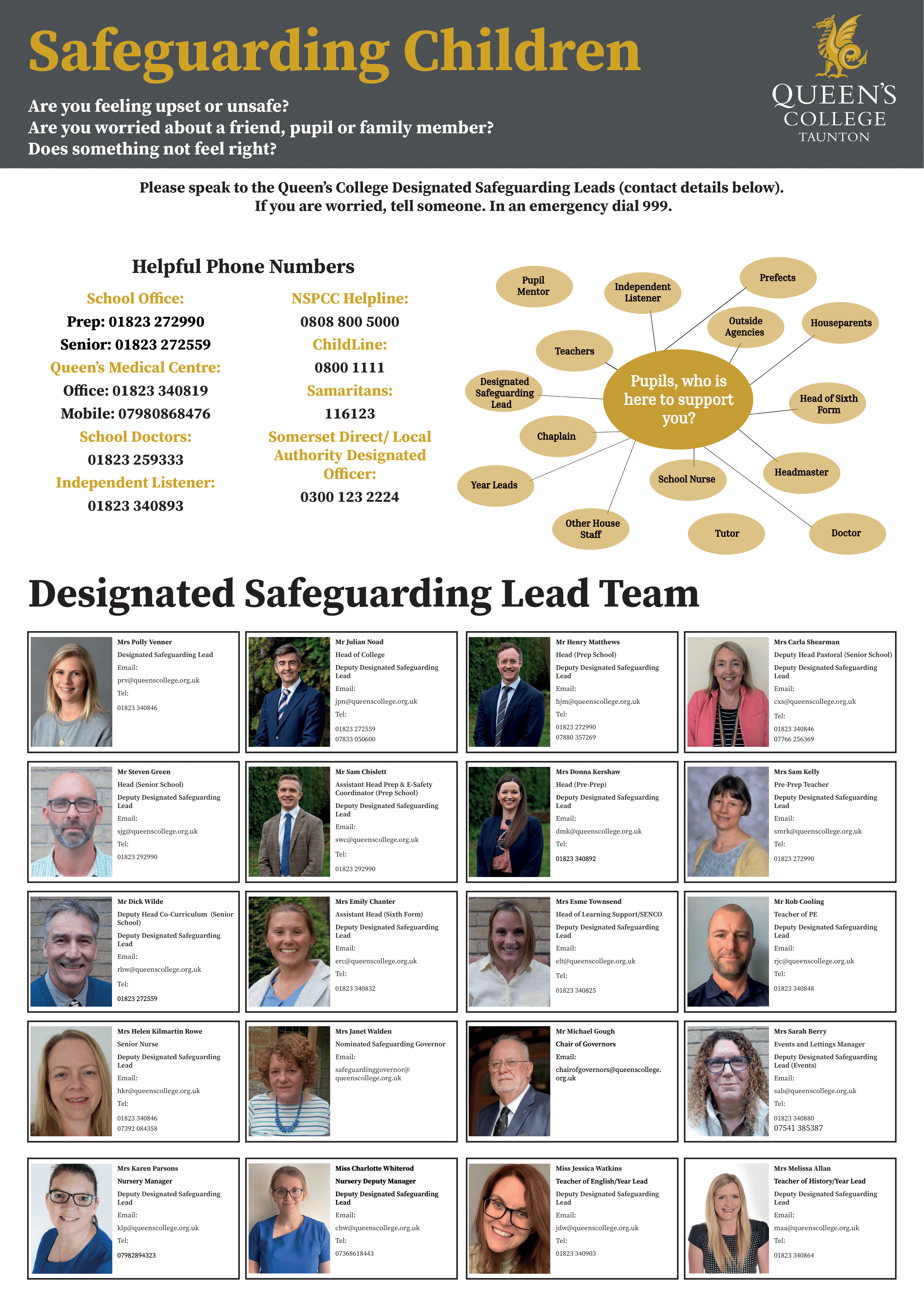 All children at Queen’s College should feel safe and empowered to speak up if they have any concerns about themselves or their peers. Safeguarding and positive wellbeing are the most important aspects of what we do at Queen’s College and are embedded in our culture of putting the child at the centre of all of our thinking and our actions. All college staff and children are trained and educated to be vigilant and to raise concerns immediately and we urge parents and visitors to get in touch using the contact details below if they have any concerns.