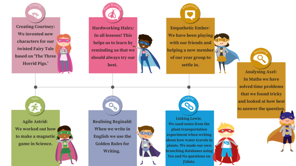 In English, we are consistently linking the skills we have been taught to ensure that our writing is the most creative it can be. For instance, in our most recent piece of work, a diary entry, the children worked hard to envision an imaginative school. In Maths, we use our analysing skills to logically think through processes to ensure we get the correct answer. However, if we make mistakes, we are agile with our thinking and are able to think around the problem to explore a new way of resolving the question. In Science, we use our realising skills to accurately and automatically analyse living things. During our PSHE lessons, we have focused on how we can implement British Values into our everyday lives. By following British Values in our class, we have developed key empathy skills that help us look after each other. Through this, we have also developed meta-thinking as we are now able to express ourselves confidently when discussing opinions in our class.