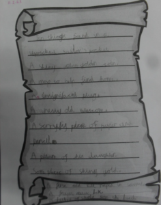 During our HPL week, we loved the challenge of including an electrical plug during our ‘Creative Day’. We managed to include this mystery item into our poem, ‘Ten Things Found in a shipwrecked Sailors Pocket’. One child wrote the line, ‘An insignificant electrical plug’ into her list poem.